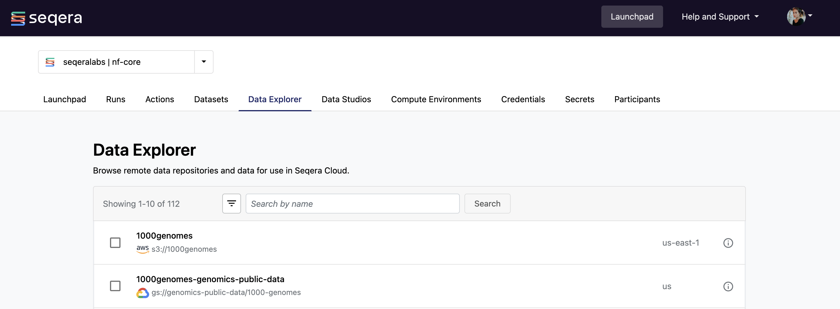 With Data Explorer, you can browse and interact with remote data repositories from organization workspaces in Seqera Platform. It supports AWS S3, Azure Blob Storage, and Google Cloud Storage repositories.